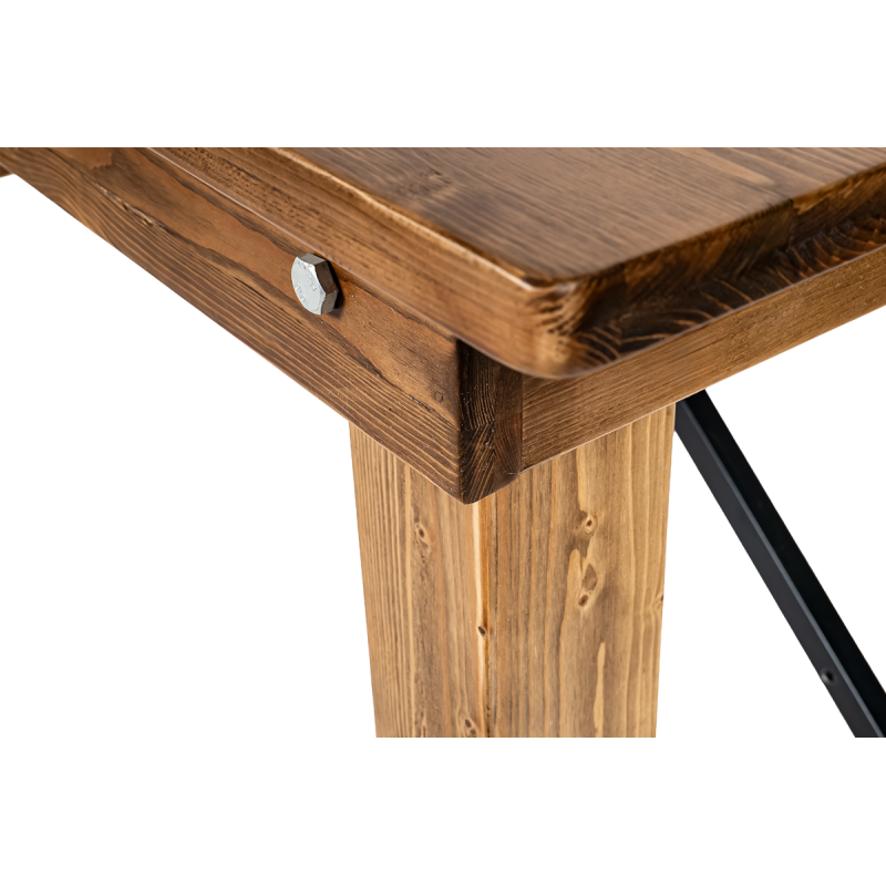 De natuurlijke structuur van grenen benadrukt de unieke charme van de tafel en brengt warmte en gezelligheid in het interieur. Zorgvuldig uitgewerkte details en de zichtbare houtnerf geven hem een authentieke, landelijke uitstraling. Metalen versterkingen vergroten de stabiliteit van de constructie en garanderen zekerheid in gebruik, zelfs tijdens grote feesten.