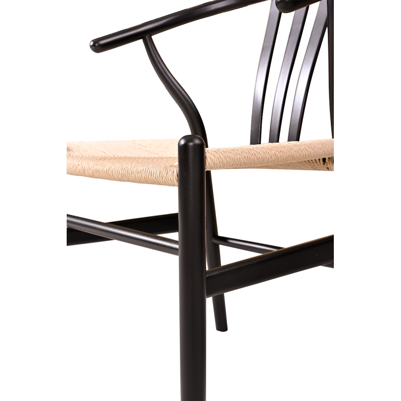 De zitting is gemaakt van gevlochten touw in een geometrisch patroon, wat het meubel een uniek karakter en een lichte uitstraling geeft. Dit zorgt niet alleen voor een esthetisch uiterlijk, maar ook voor duurzaamheid en zitcomfort. De natuurlijke tint van het touw contrasteert prachtig met het donkere frame van de stoel, waardoor een harmonieuze combinatie ontstaat van traditioneel vakmanschap en modern design.