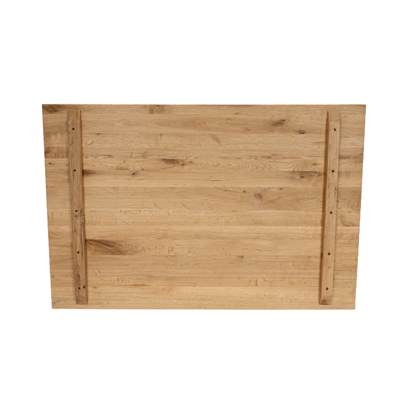 Het blad is verstevigd met speciale ondersteuningen die het risico op het zogenaamde “bananen-effect”, oftewel het kromtrekken van massief hout, beperken. Elk exemplaar verschilt in nerfstructuur en kleur, waardoor elke tafel een eigen, individueel karakter heeft. Natuurlijk eikenhout kan meerdere keren worden geschuurd en gerenoveerd, wat de levensduur aanzienlijk verlengt.