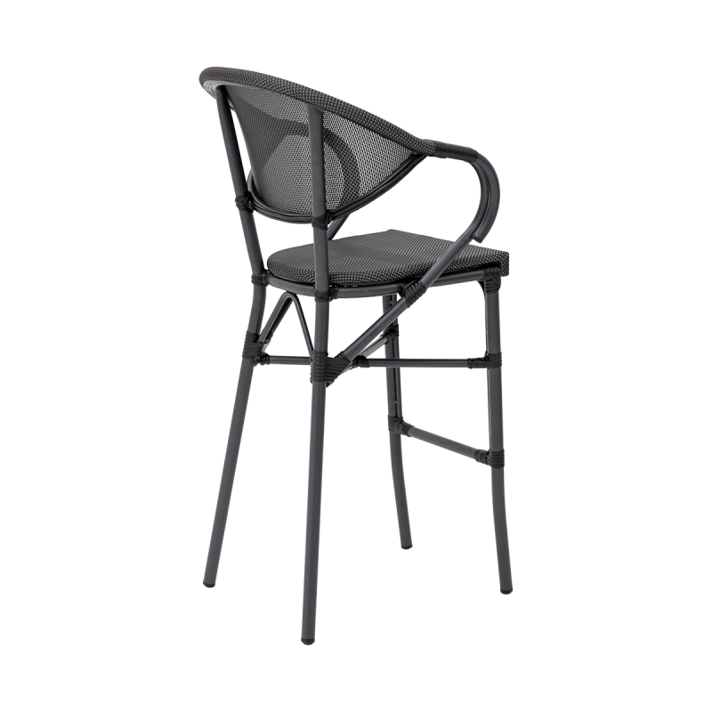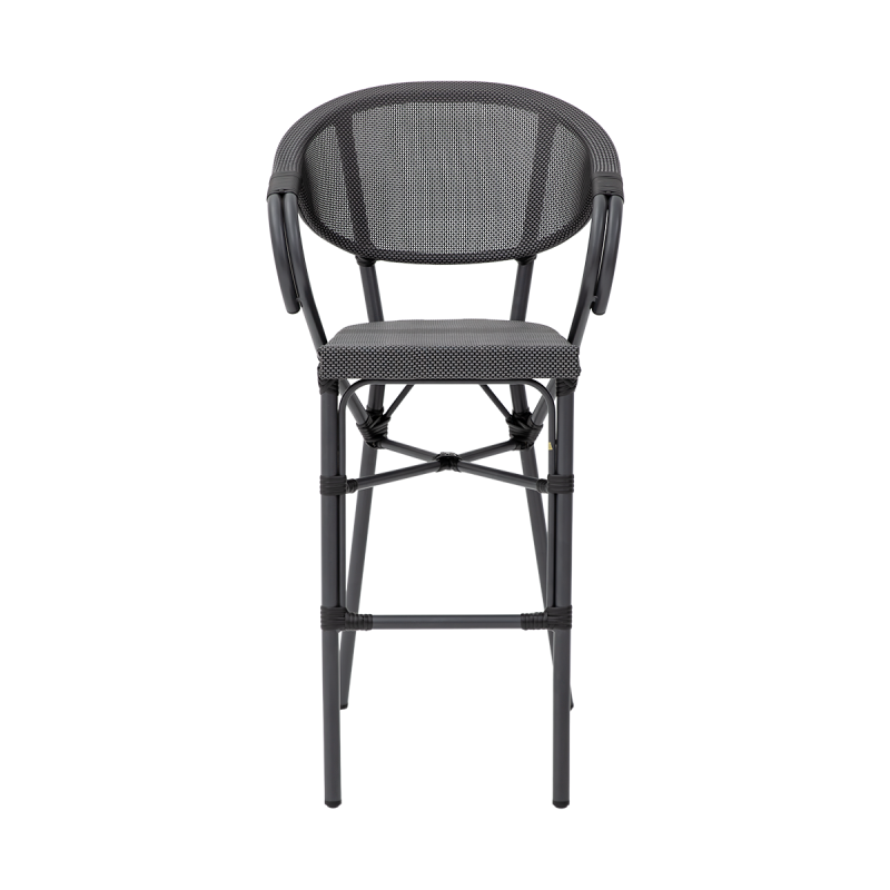 In deze uitvoering van de CAMILLO BAR zijn de zitting en rugleuning gemaakt van technorattan gaas dat strak over de constructie is gespannen, waardoor een gelijkmatig en stabiel oppervlak ontstaat. Deze vorm biedt comfortabele ondersteuning en de nodige flexibiliteit, vooral bij langdurig gebruik. Het fijne, dichte vlechtwerk geeft een elegante uitstraling en presteert goed in intensief gebruikte ruimtes. Dit alles in combinatie met weerstand tegen UV-straling.